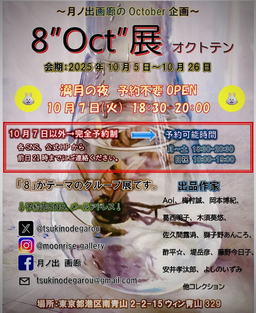 東京、南青山の月ノ出画廊さんにて10月5日より開催の『8“oct”展』に作品を出品させて頂きます。